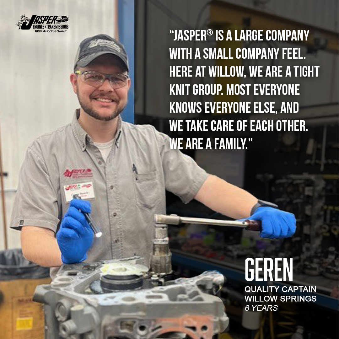 "Jasper Engines has given me a good job with benefits to provide for my family, and a work schedule that lets me spend time with them, as well as serve in the National Guard. I know that even when my life is hard outside of work, I have my place here where people care about and support me."