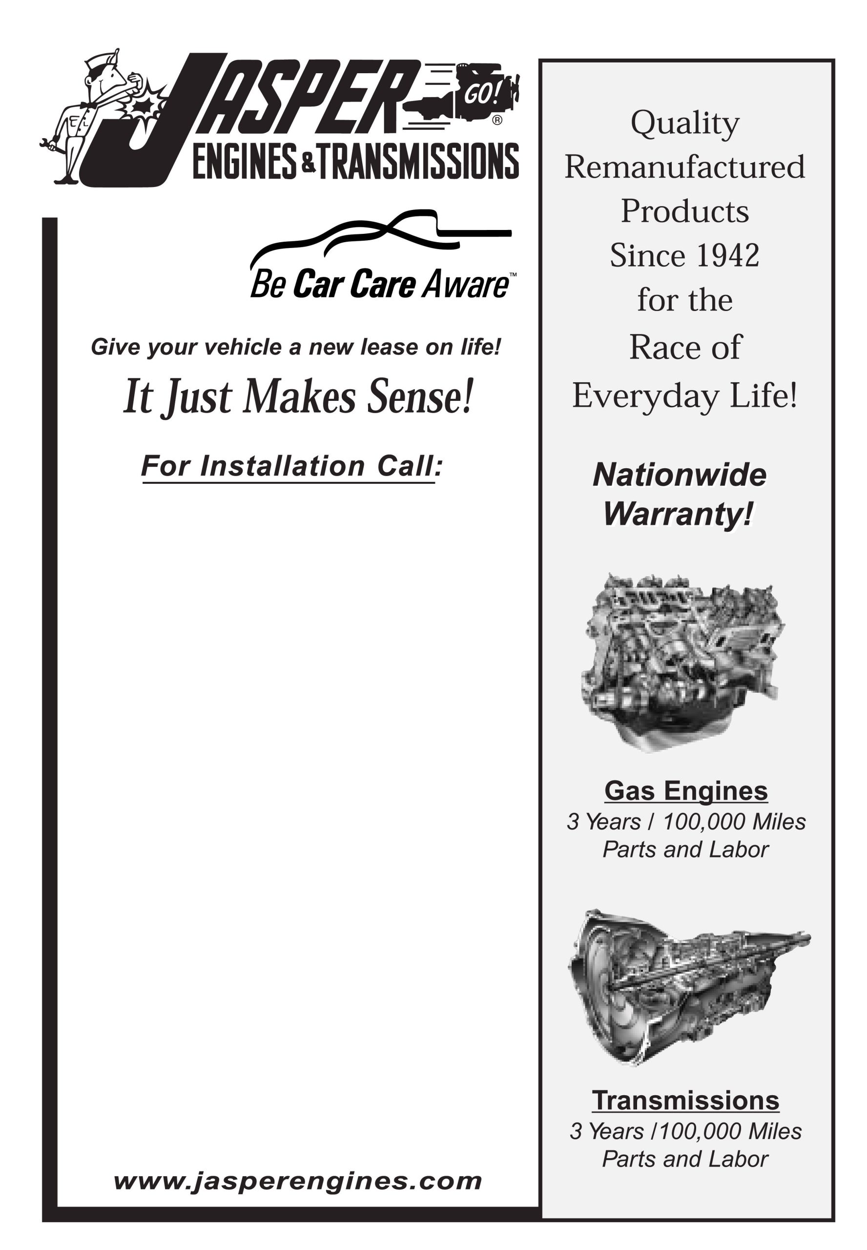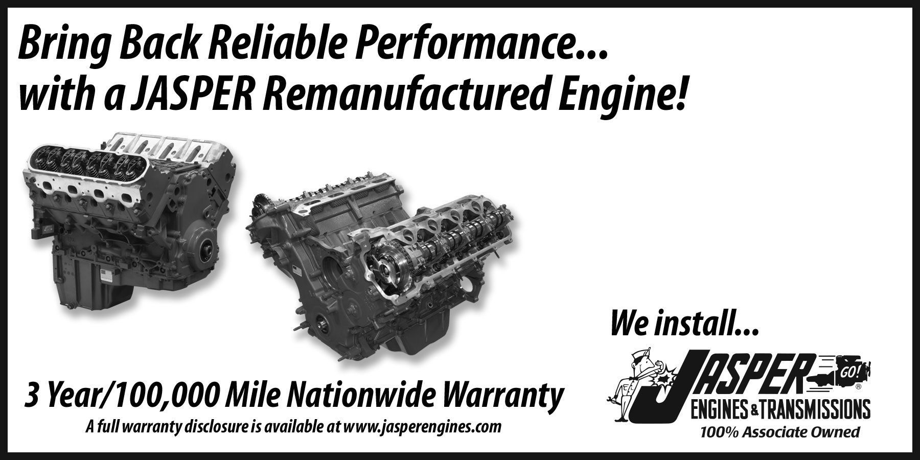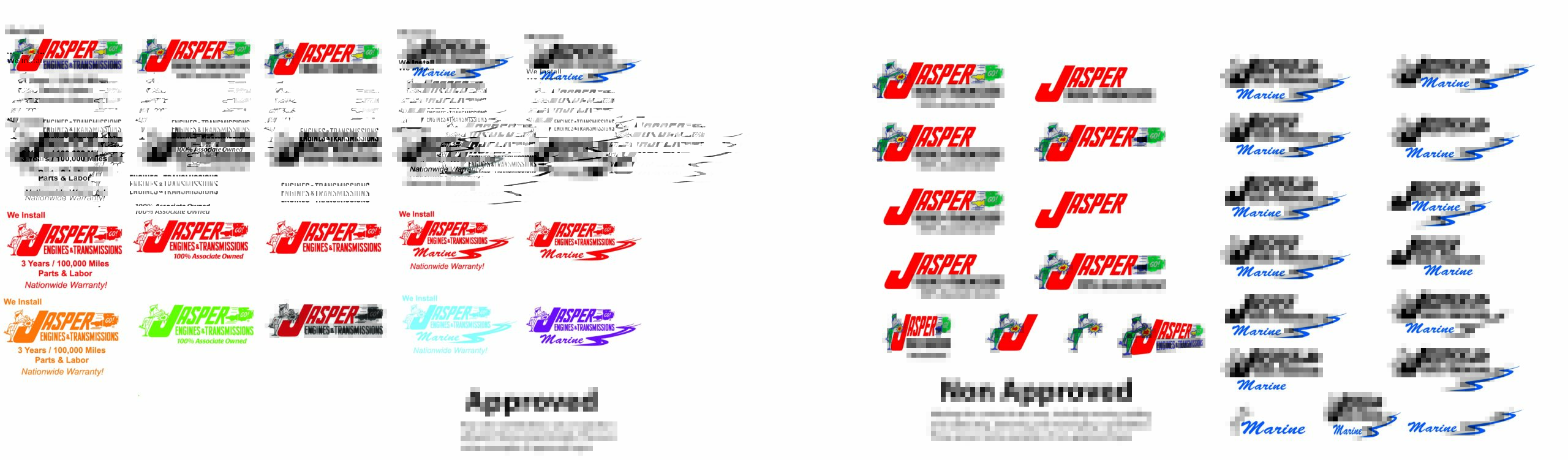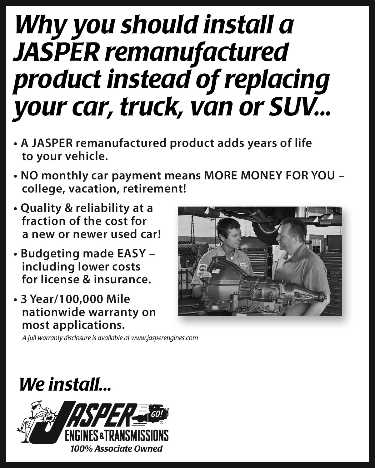 Note: The JASPER logo with the words “We Install” and the warranty, as shown at the left, is the minimum that must be included in your ad for it to be considered for Co-op Advertising. We encourage you, however, to design ads with greater JASPER content. When doing this, you can use the other logos supplied. Please keep in mind the size of the JASPER content in your ad in order to adequately promote JASPER products, the sale of which adds profit to your business. Proper JASPER content also allows you to better utilize the Co-op funds available to you. Please refer to the Co-op Reimbursement Examples and the JASPER Ready-Made Ads for ideas in designing your ads.