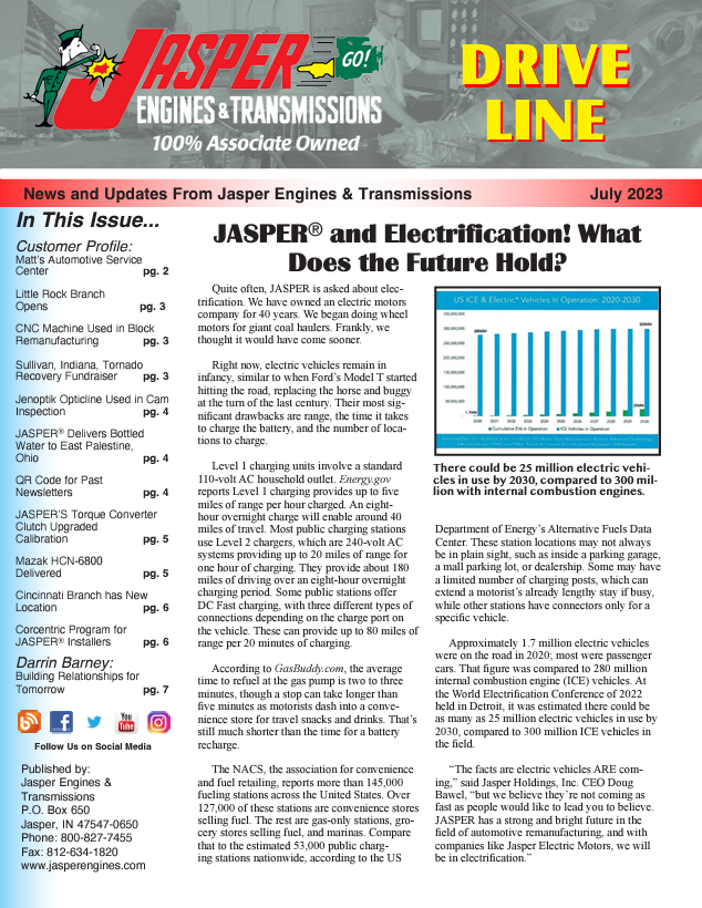 Features: Customer Profile: Matt’s Automotive Service Center pg. 2, Little Rock Branch Opens pg. 3, CNC Machine Used in Block Remanufacturing pg. 3, Sullivan, Indiana, Tornado Recovery Fundraiser pg. 3, Jenoptik Opticline Used in Cam Inspection pg. 4, JASPER® Delivers Bottled Water to East Palestine, Ohio pg. 4, QR Code for Past Newsletters pg. 4, JASPER’S Torque Converter Clutch Upgraded Calibration pg. 5, Mazak HCN-6800 Delivered pg. 5, Cincinnati Branch has New Location pg. 6, Corcentric Program for JASPER® Installers pg. 6, Darrin Barney: Building Relationships for Tomorrow pg. 7