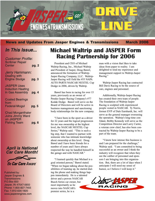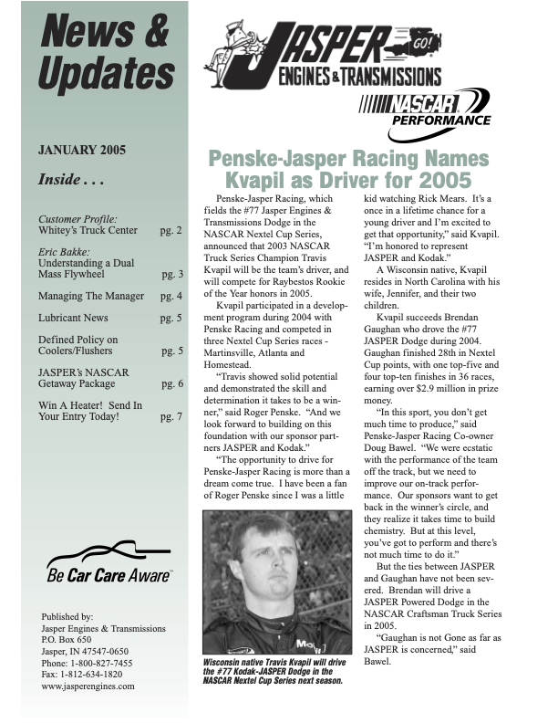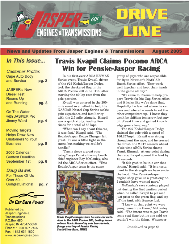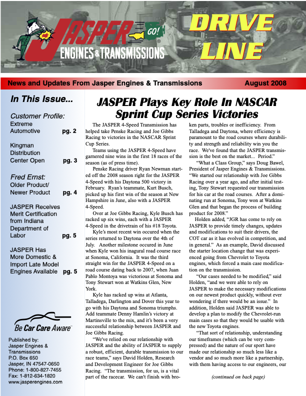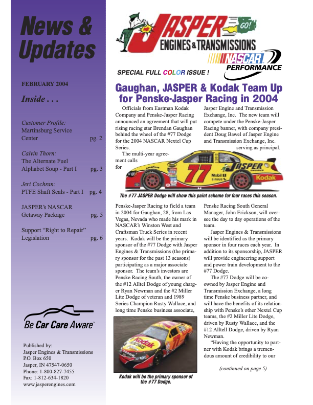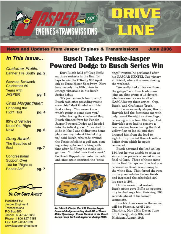 Features: Customer Profile: Busch Takes Penske-Jasper Powered Dodge to Busch Series Win, Gervase Schwenk Celebrates 60 years at JASPER®, Banner Tire South, Schedule the JASPER® Show Car At Your Business, 85% of Vehicles Need You Right Now, The Beauties of God, Congressional Support Over 100 for “Right to Repair Act”, Associate Shows His Artistic Talent.