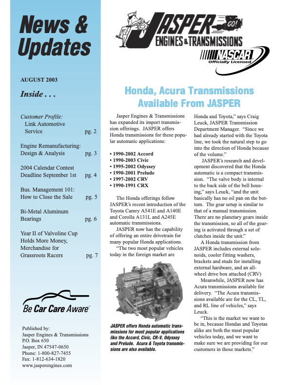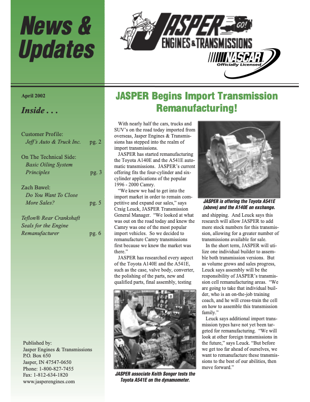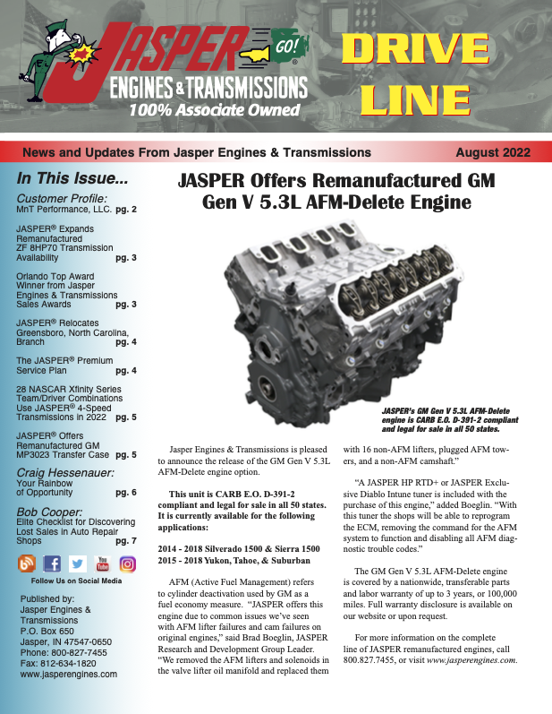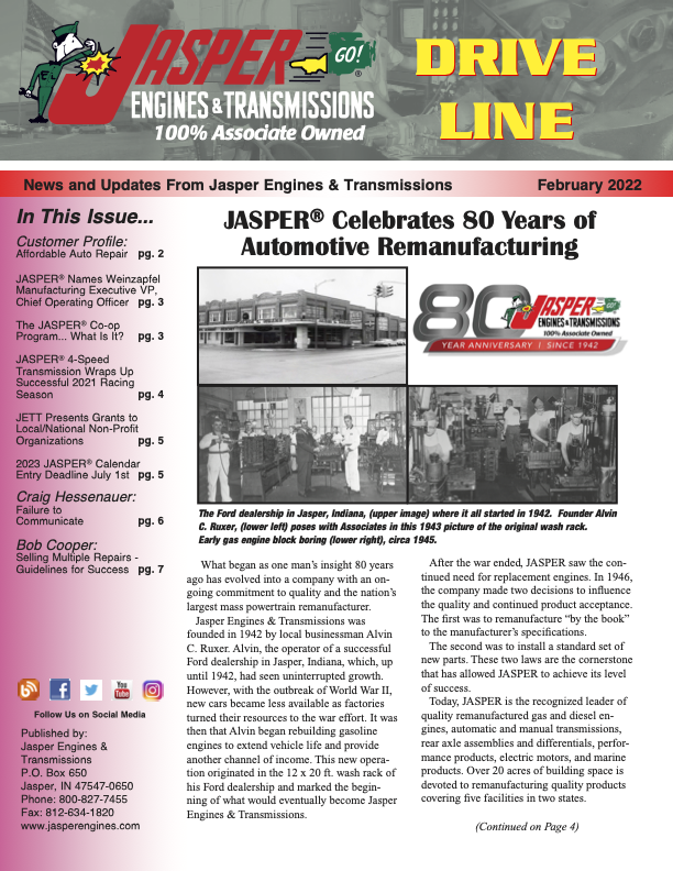 Features: Customer Profile: Affordable Auto Repair pg. 2, JASPER® Names Weinzapfel Manufacturing Executive VP, Chief Operating Officer pg. 3, The JASPER® Co-op Program… What Is It? pg. 3, JASPER® 4-Speed Transmission Wraps Up Successful 2021 Racing Season pg. 4, JETT Presents Grants to Local/National Non-Profit Organizations pg. 5, 2023 JASPER® Calendar Entry Deadline July 1st pg. 5, Craig Hessenauer: Failure to Communicate pg. 6, Bob Cooper: Selling Multiple Repairs – Guidelines for Success pg. 7
