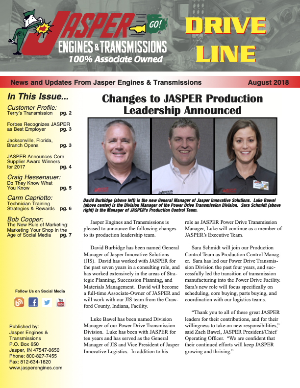 Features: Customer Profile: Terry’s Transmission, Forbes Recognizes JASPER® as Best Employer, Jacksonville, Florida, Branch Opens, JASPER® Announces Core Supplier Award Winners for 2017, Craig Hessenauer: Do They Know What You Know, Carm Capriotto: Technician Training Strategies & Rewards, Bob Cooper: The New Rule of Marketing: Marketing Your Shop in the Age of Social Media