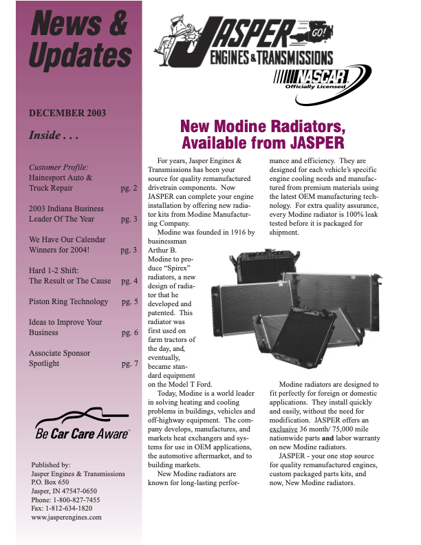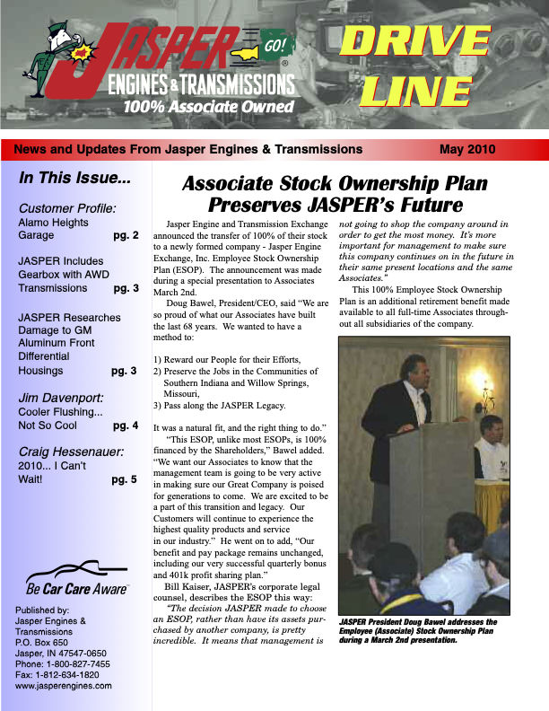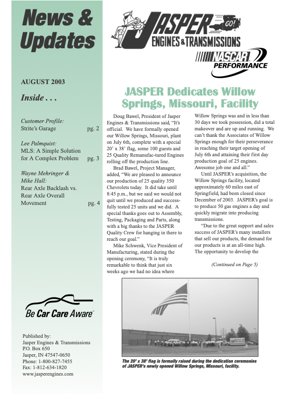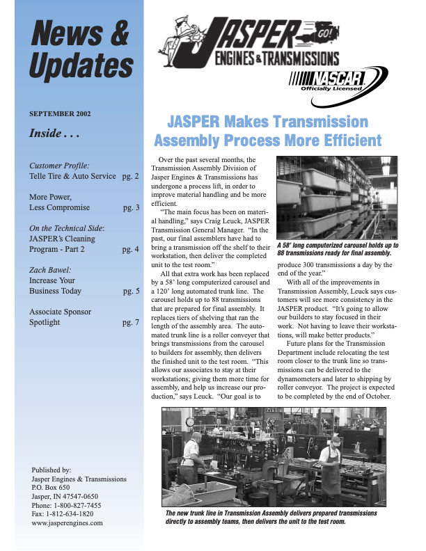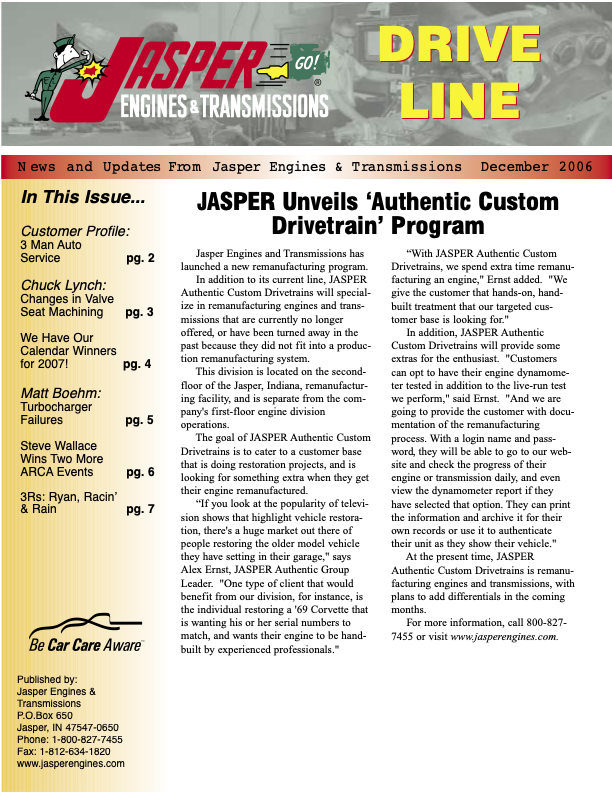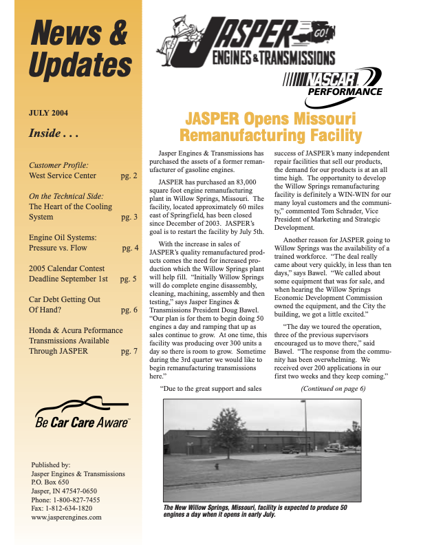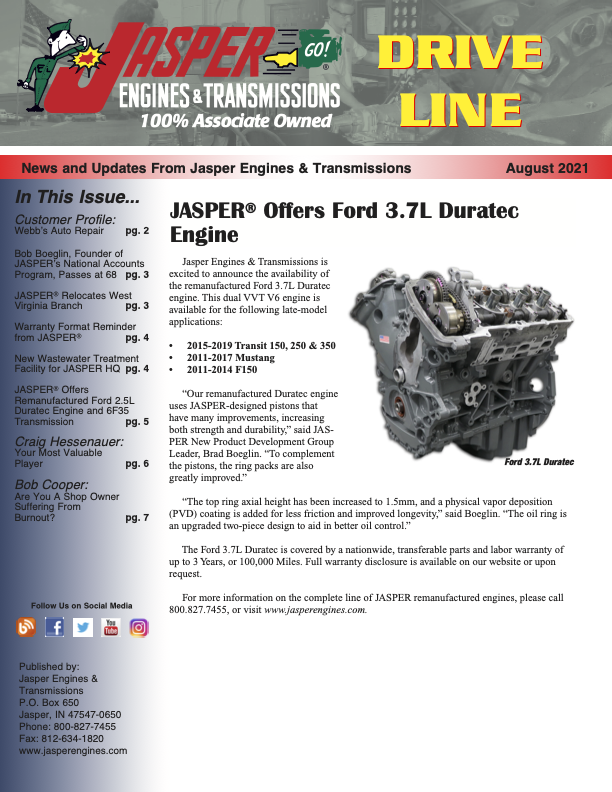 Features: Customer Profile: Customer Profile: Webb’s Auto Repair pg. 2, Bob Boeglin, Founder of JASPER’s National Accounts, Program, Passes at 68 pg. 3, JASPER® Relocates West Virginia Branch pg. 3, Warranty Format Reminder from JASPER® pg. 4, New Wastewater Treatment Facility for JASPER HQ pg. 4, JASPER® Offers Remanufactured Ford 2.5L Duratec Engine and 6F35 Transmission pg. 5, Craig Hessenauer: Your Most Valuable Player pg. 6, Bob Cooper: Are You A Shop Owner Suffering From Burnout? pg. 7