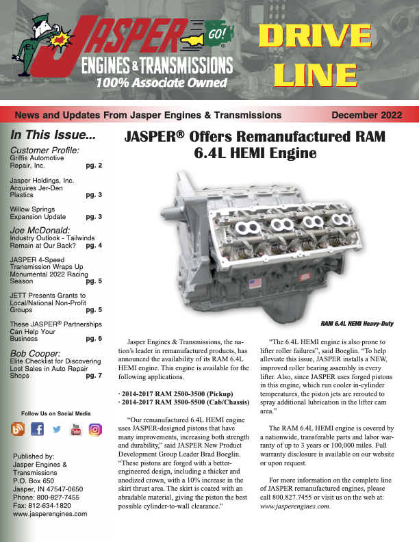 Features: Customer Profile: Griffis Automotive Repair, Inc. pg. 2, Jasper Holdings, Inc. Acquires Jer-Den Plastics pg. 3, Willow Springs Expansion Update pg. 3, Joe McDonald: Industry Outlook – Tailwinds Remain at Our Back? pg. 4, JASPER 4-Speed Transmission Wraps Up Monumental 2022 Racing Season pg. 5, JETT Presents Grants to Local/National Non-Profit Groups pg. 5, These JASPER® Partnerships Can Help Your Business pg. 6, Bob Cooper: Elite Checklist for Discovering Lost Sales in Auto Repair Shops pg. 7