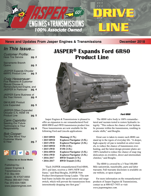 Features: Customer Profile: Hess Tire Service, Sacramento Branch Opens, JASPER® Expands Chrysler 68RFE Product Line, Craig Hessenauer: Five Reasons A Customer Should Choose A Remanufactured Engine, and JASPER® In Particular, JASPER® Earns Business of the Year Honors, GM 6L80E Product Line Expanded, JASPER® Offers Expanded Chrysler 5.7L HEMI V8 Product Line, Carm Capriotto: Seeding Our Future Technicians is Your Responsibility, Bob Cooper: The One Word Your Customer Wants to Hear