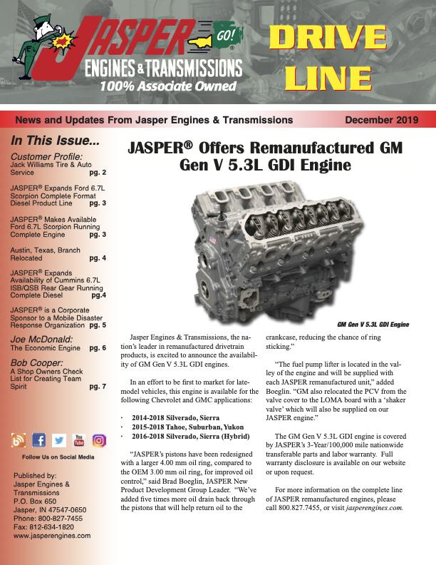 Features: Customer Profile: Jack Williams Tire & Auto Service, JASPER® Expands Ford 6.7L Scorpion Complete Format Diesel Product Line, JASPER® Makes Available Ford 6.7L Scorpion Running Complete Engine, Austin, Texas, Branch Relocated, JASPER® Expands Availability of Cummins 6.7L ISB/QSB Rear Gear Running Complete Diesel, JASPER® is a Corporate Sponsor to a Mobile Disaster Response Organization, Joe McDonald: The Economic Engine, Bob Cooper: A Shop Owners Check List for Creating Team Spirit