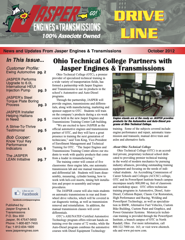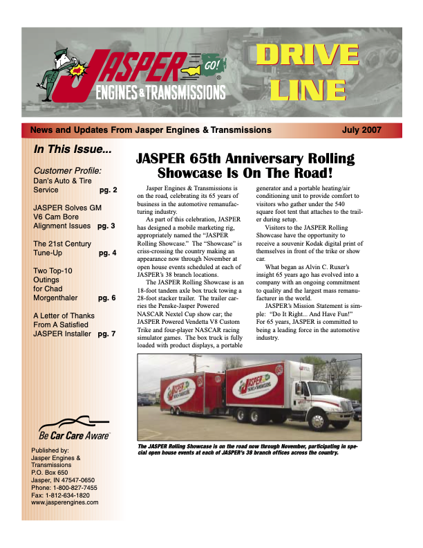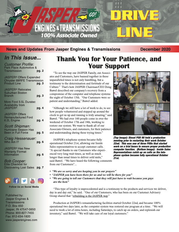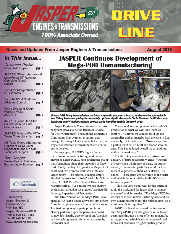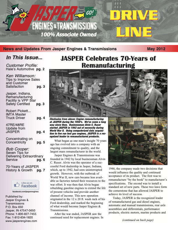 Features: Customer Profile: Hale’s Automotive, JASPER® Celebrates 70-Years of Remanufacturing, Ken Williamson: Tips to Improve Sales and Customer Satisfaction, Jasper Indiana Remanufacturing Facility is VPP Star Safety Certified, Robert Pickett… IMTA Master Truck Driver, 47RE/48RE Update from JASPER®, Concentrating on Concentricity, Bob Cooper: Seven Tips for Delivering Extraordinary Service, 70-Years of JASPER® History & Growth