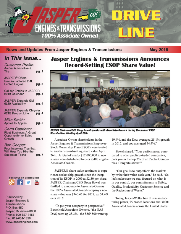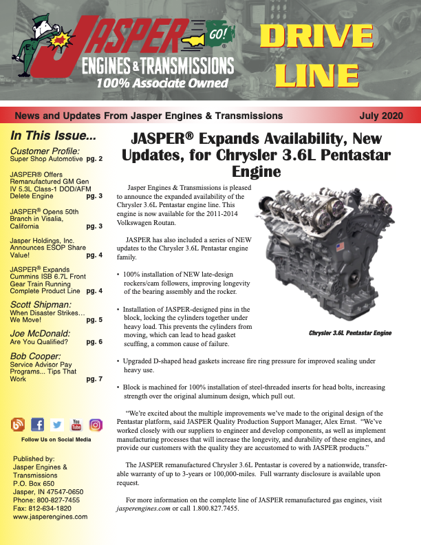 Features: Customer Profile: Super Shop Automotive, JASPER® Offers Remanufactured GM Gen IV 5.3L Class-1 DOD/AFM Delete Engine, JASPER® Opens 50th Branch in Visalia, California, Jasper Holdings, Inc. Announces ESOP Share Value!, JASPER® Expands Cummins ISB 6.7L Front Gear Train Running Complete Product Line, Scott Shipman: When Disaster Strikes… We Move!, Joe McDonald: Are You Qualified?, Bob Cooper: Service Advisor Pay Programs… Tips That Work