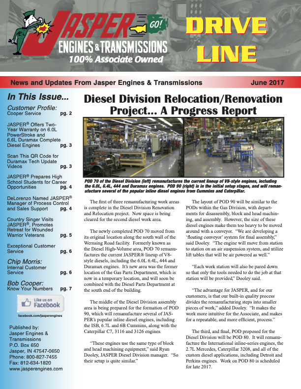 Features: Customer Profile: Cooper Service, JASPER® Offers TwoYear Warranty on 6.0L PowerStroke and 6.6L Duramax Complete Diesel Engines, Scan This QR Code for Duramax Tech Update Videos, JASPER® Prepares High School Students for Career Opportunities, DeLorenzo Named JASPER® Manager of Process Control and Sales Support, Country Singer Visits JASPER®, Promotes Retreat for Wounded Warrior Veterans, Exceptional Customer Service, Chip Morris: Internal Customer Service, Bob Cooper: Know Your Numbers