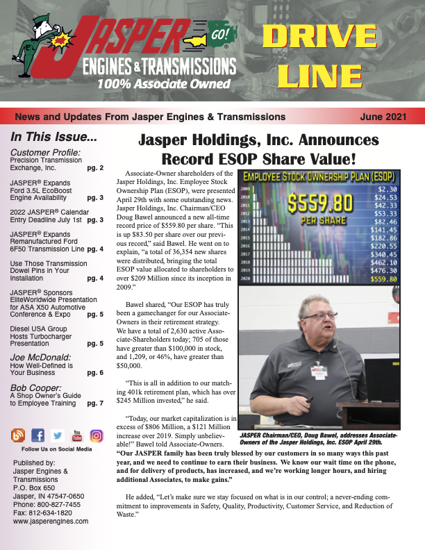 Features: Customer Profile: Precision Transmission Exchange, Inc. pg. 2, JASPER® Expands Ford 3.5L EcoBoost Engine Availability pg. 3, 2022 JASPER® Calendar Entry Deadline July 1st pg. 3, JASPER® Expands Remanufactured Ford 6F50 Transmission Line pg. 4, Use Those Transmission Dowel Pins in Your Installation pg. 4, JASPER® Sponsors EliteWorldwide Presentation for ASA X50 Automotive Conference & Expo pg. 5, Diesel USA Group Hosts Turbocharger Presentation