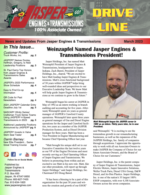 Features: Customer Profile: Truck Works, Inc. pg. 2, JASPER® Names Dooley, Hoffman, Gregory, to New Leadership Positions pg. 3, St. Paul Earns Top Honors from Jasper Engines & Transmissions Sales Awards pg. 3, JASPER’s 2023 Performance Show Schedule pg. 4, Easy to Find Co-op Information pg. 4, QR Code for Past Newsletters pg. 4. 2024 JASPER® Calendar Entry Deadline July 1st pg. 5, NASCAR® Xfinity Series/Craftsman Truck Series Teams Using JASPER® 4-Speed Transmissions in 2023 pg. 5, Additional Leadership Positions Announced by JASPER® pg. 6, JASPER® Invests in Valve Stem Seal Tester pg. 6, Darrin Barney: New Elite President… Same Great Training Course pg. 7