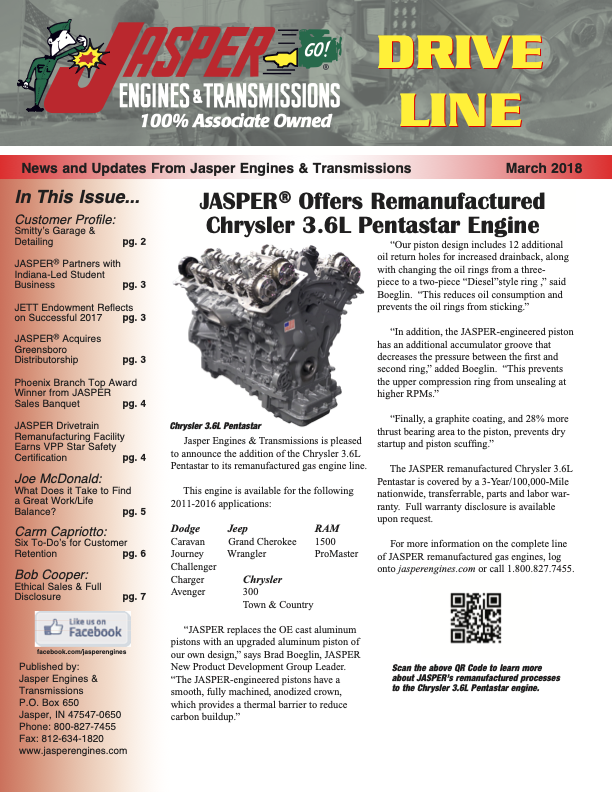 Features: Customer Profile: Smitty’s Garage & Detailing, JASPER® Partners with Indiana-Led Student Business, JETT Endowment Reflects on Successful 2017, JASPER® Acquires Greensboro Distributorship, Phoenix Branch Top Award Winner from JASPER® Sales Banquet, JASPER® Drivetrain Remanufacturing Facility Earns VPP Star Safety Certification, Joe McDonald: What Does it Take to Find a Great Work/Life Balance?, Carm Capriotto: Six To-Do’s for Customer Retention, Bob Cooper: Ethical Sales & Full Disclosure