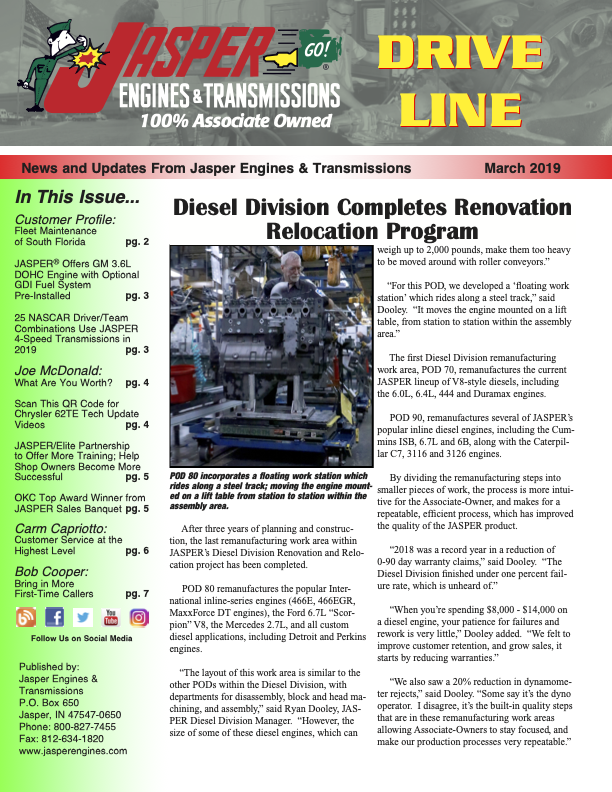 Features: Customer Profile: Fleet Maintenance of South Florida, JASPER® Offers GM 3.6L DOHC Engine with Optional GDI Fuel System Pre-Installed, 25 NASCAR Driver/Team Combinations Use JASPER® 4-Speed Transmissions in 2019, Joe McDonald: What Are You Worth?, Scan This QR Code for Chrysler 62TE Tech Update Videos, JASPER®/Elite Partnership to Offer More Training; Help Shop Owners Become More Successful, OKC Top Award Winner from JASPER® Sales Banquet, Carm Capriotto: Customer Service at the Highest Level, Bob Cooper: Bring in More First-Time Callers