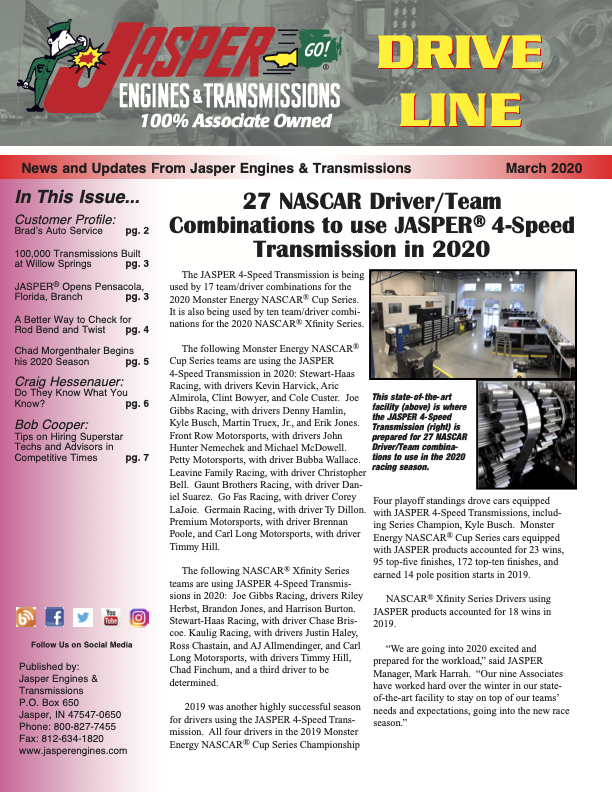 Features: Customer Profile: Brad’s Auto Service, 100,000 Transmissions Built at Willow Springs, JASPER® Opens Pensacola, Florida, Branch, A Better Way to Check for Rod Bend and Twist, Chad Morgenthaler Begins his 2020 Season, Craig Hessenauer: Do They Know What You Know?, Bob Cooper: Tips on Hiring Superstar Techs and Advisors in Competitive Times