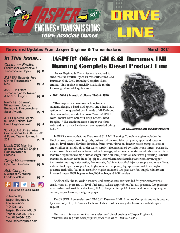 Features: Customer Profile: Schrimsher Automotive & Transmission Repair pg. 2, JASPER® Expands Ford 6R140 Transmission Line pg. 3, JASPER® Offers Turbocharger for Nissan Juke 1.6L Engine pg. 3, Nashville Top Award Winner from Jasper Engines & Transmissions Sales Awards pg. 4, JETT Presents Grants to Local/National Non-Profit Organizations pg. 4, 30 NASCAR Driver/Team Combinations Use JASPER® 4-Speed Transmissions in 2021 pg. 5, Mazak CNC Machine added to JASPER Engine Remanufacturing Process pg. 5, Craig Hessenauer: Open for Business pg. 6, Bob Cooper: 5 Steps for Creating Leaders Within