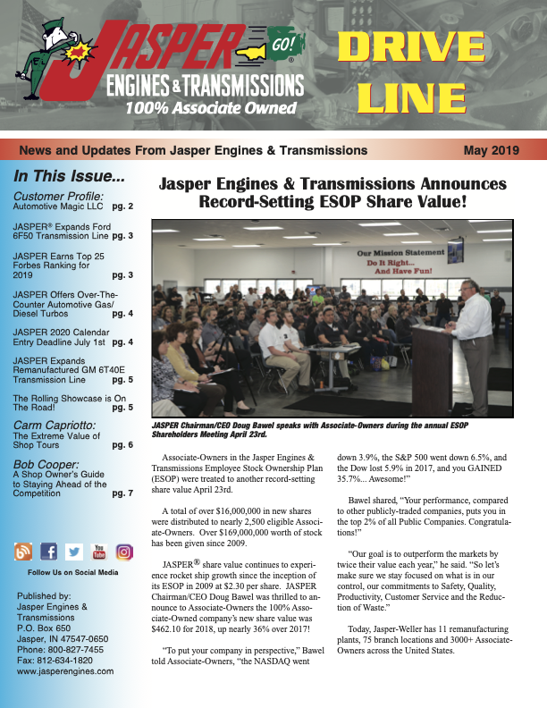 Features: Customer Profile: Automotive Magic LLC, JASPER® Expands Ford 6F50 Transmission Line, JASPER® Earns Top 25 Forbes Ranking for 2019, JASPER® Offers Over-TheCounter Automotive Gas/Diesel Turbos, JASPER® 2020 Calendar Entry Deadline July 1st, JASPER® Expands Remanufactured GM 6T40E Transmission Line, The Rolling Showcase is On The Road!, Carm Capriotto: The Extreme Value of Shop Tours, Bob Cooper: A Shop Owner’s Guide to Staying Ahead of the Competition