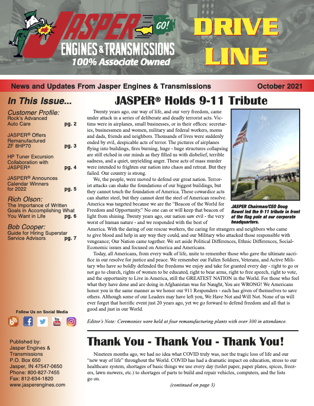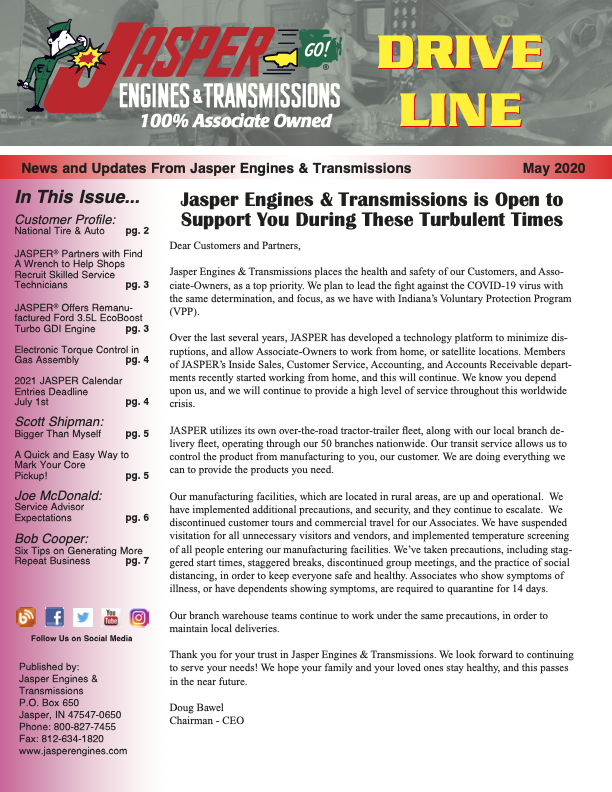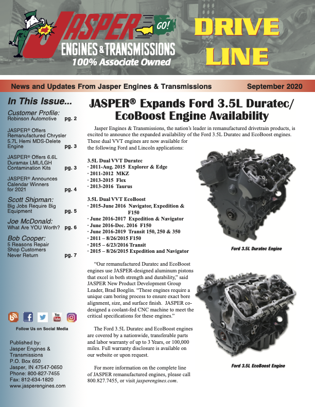 Features: Customer Profile: National Tire & Auto, JASPER® Partners with Find A Wrench to Help Shops Recruit Skilled Service Technicians, JASPER® Offers Remanufactured Ford 3.5L EcoBoost Turbo GDI Engine, Electronic Torque Control in Gas Assembly, 2021 JASPER® Calendar Entries Deadline July 1st, Scott Shipman: Bigger Than Myself, A Quick and Easy Way to Mark Your Core Pickup!, Joe McDonald: Service Advisor Expectations, Bob Cooper: Six Tips on Generating More Repeat Business