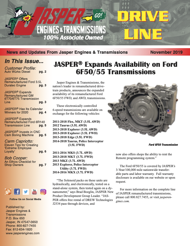Features: Customer Profile: Auto Würks Diesel, JASPER® Offers Remanufactured Ford 3.5L Duratec Engine, JASPER® Expands Remanufactured GM 6T70/6T75 Transmission Line, JASPER® Has Its Calendar Winners for 2020, JASPER® Expands Remanufactured Ford 6R140 Transmission Line, JASPER® Invests in CNC Cam Boring Machine, Carm Capriotto: Eleven Tips for Creating ‘Extreme Employee Loyalty’, Bob Cooper: An Ethics Checklist for Shop Owners
