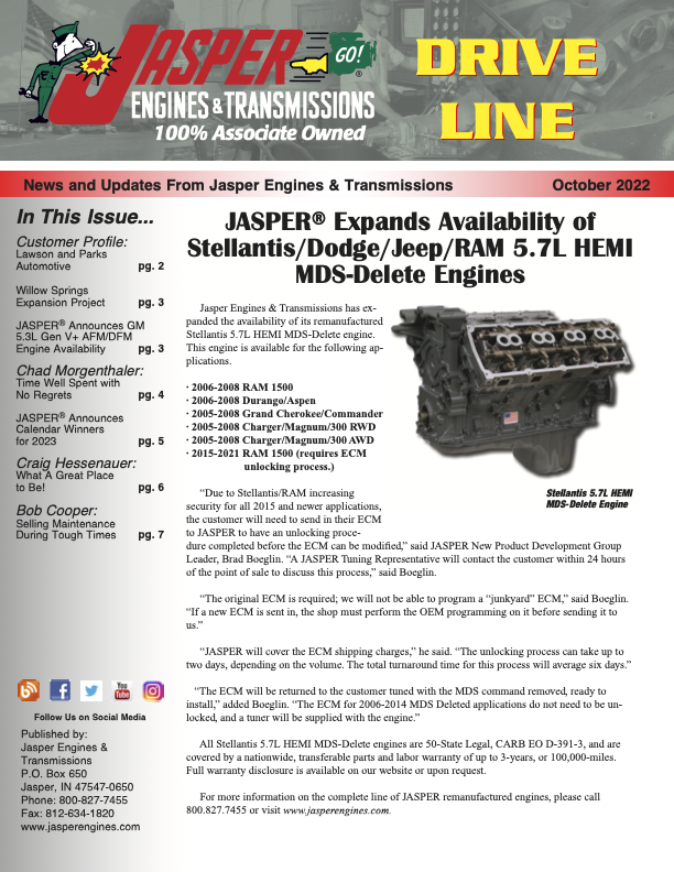 Features: Customer Profile: Robinson Automotive, JASPER® Offers Remanufactured Chrysler 5.7L Hemi MDS-Delete, Engine, JASPER® Offers 6.6L Duramax LML/LGH Contamination Kits, JASPER® Announces Calendar Winners for 2021, Scott Shipman: Big Jobs Require Big Equipment, Joe McDonald: What Are YOU Worth?, Bob Cooper: 5 Reasons Repair Shop Customers Never Return