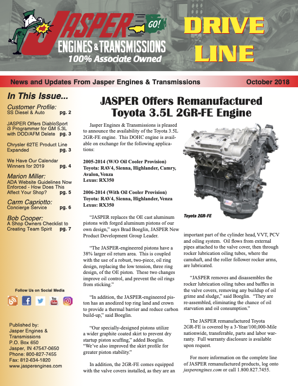 Features: Customer Profile: SS Diesel & Auto, JASPER® Offers DiabloSport i3 Programmer for GM 5.3L with DOD/AFM Delete, Chrysler 62TE Product Line Expanded, We Have Our Calendar Winners for 2019, Marion Miller: ADA Website Guidelines Now Enforced – How Does This Affect Your Shop?, Carm Capriotto: Concierge Service, Bob Cooper: A Shop Owners Checklist to Creating Team Spirit
