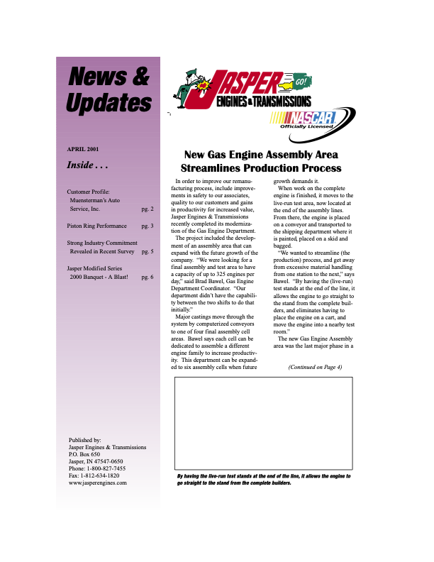 Features: Customer Profile: Muensterman’s Auto Services, Inc., Piston Ring Performance, Strong Industry Commitment Revealed in Recent Survey, JASPER® Modified Series 2001 Banquet – A Blast!