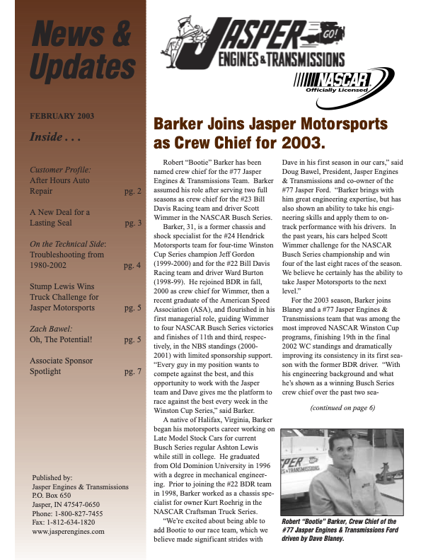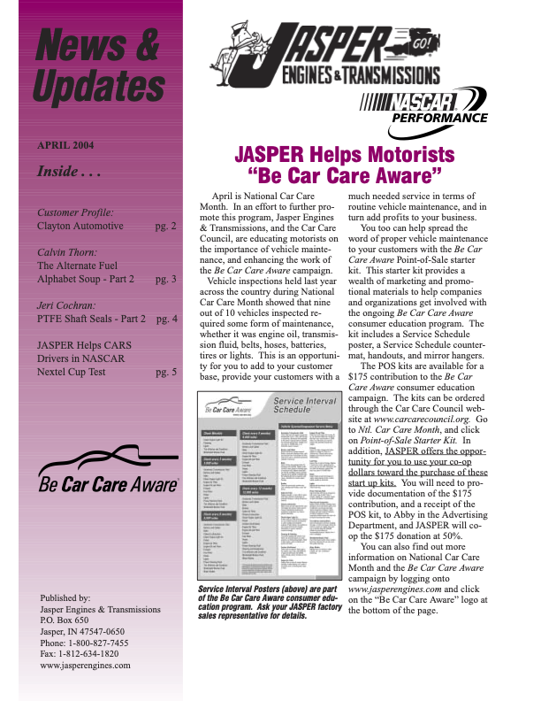 Features: Customer Profile: Clayton Automotive, Calvin Thorn: The Alternate Fuel Alphabet Soup – Part 2, Jeri Cochran: PTFE Shaft Seals – Part 2, JASPER Helps CARS Drivers in NASCAR Nextel Cup Test.