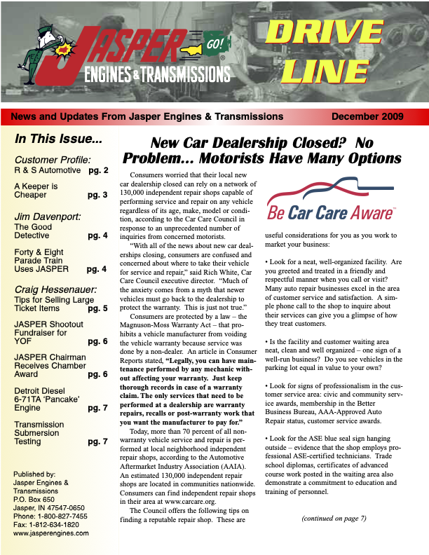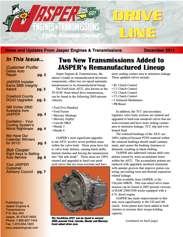 Features: Customer Profile: Dallas Auto Repair, JASPER® Installer Earns BBB Integrity Award, Crawford County DOJO Upgrades, GM Vortec 2900 Available from JASPER®, Cavitation – Your Cooling System’s Worst Nightmare, We Have Our Calendar Winners for 2012!, Bob Cooper: Eight Keys to Selling Auto Service, Your JASPER® Customer Advisory Council