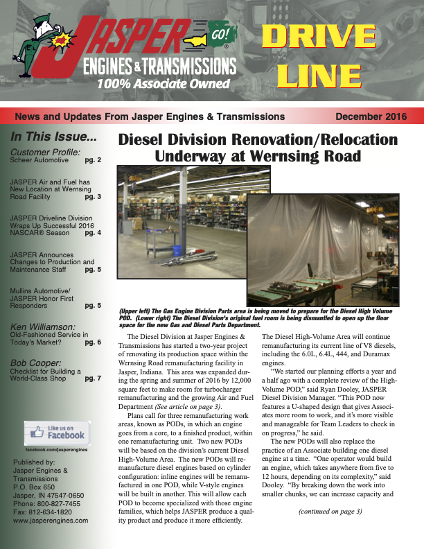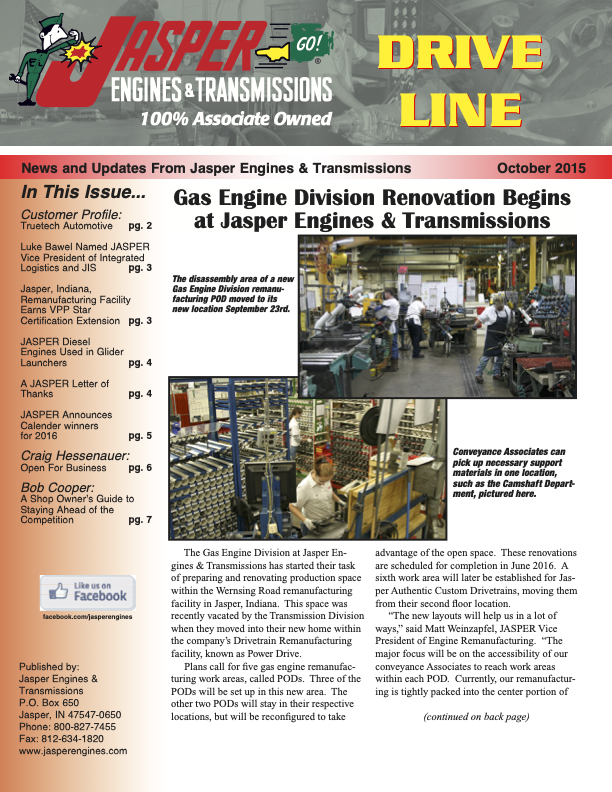 Features: Customer Profile: Truetech Automotive, Luke Bawel Named JASPER® Vice President of Integrated Logistics and JIS, Jasper, Indiana, Remanufacturing Facility Earns VPP Star Certification Extension, JASPER® Diesel Engines Used in Glider Launchers, A JASPER® Letter of Thanks, JASPER® Announces Calendar Winners for 2016, Craig Hessenauer: Open For Business, Bob Cooper: A Shop Owner’s Guide to Staying Ahead of the Competition