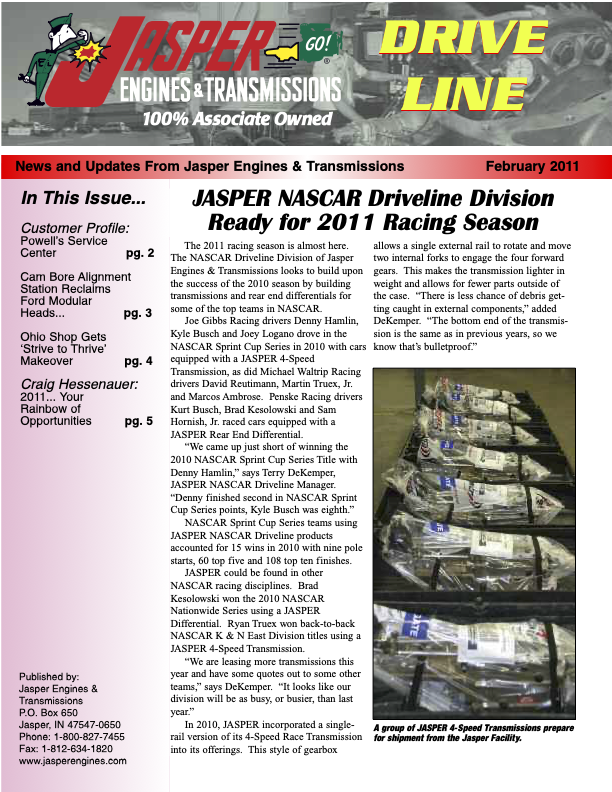 Features: JASPER® NASCAR Driveline Division Ready for 2011 Racing Season, Customer Profile: Powell’s Service Center, Cam Bore Alignment Station Reclaims Ford Modular Heads…, Ohio Shop Gets ‘Strive to Thrive’ Makeover, Craig Hessenauer: 2011… Your Rainbow of Opportunities