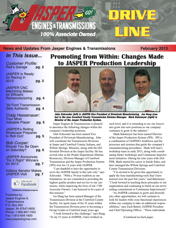 Features: Customer Profile: Red’s Garage, JASPER® is Ready for Racing in 2013, JASPER® CNC Machining Makes for Efficient Remanufacturing, ’32 Ford Transmission Get Authentic, Craig Hessenauer: Your Most Valuable Player, JASPER’s Rolling Showcase Prepares to Roll Out!, Bob Cooper: Should You Be Open on Saturday?, JASPER® Announces “Do It Right” Winners for 2012, Indiana Senator Makes JASPER® Visit