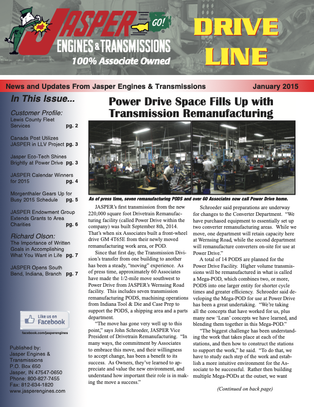 Features: Customer Profile: Lewis County Fleet Services, Canada Post Utilizes JASPER® in LLV Project, Jasper Eco-Tech Shines Brightly at Power Drive, JASPER® Calendar Winners for 2015, Morgenthaler Gears Up for Busy 2015 Schedule, JASPER® Endowment Group Extends Grants to Area Charities, Richard Olson: The Importance of Written Goals in Accomplishing What You Want in Life, JASPER® Opens South Bend, Indiana, Branch