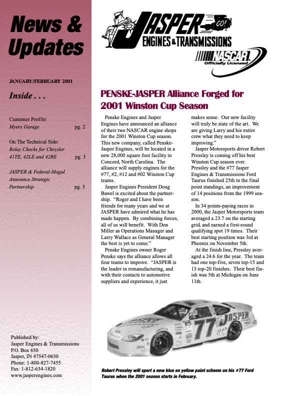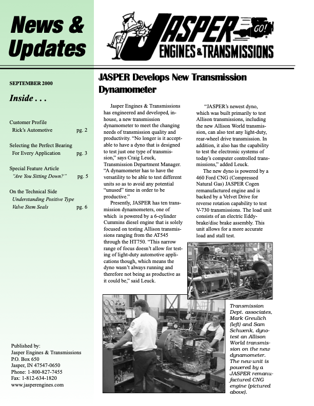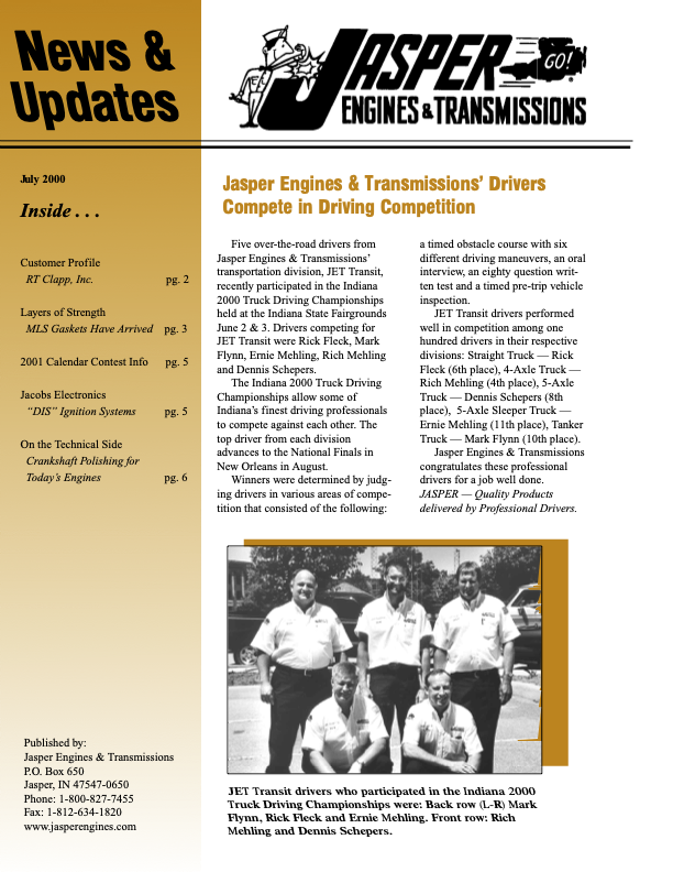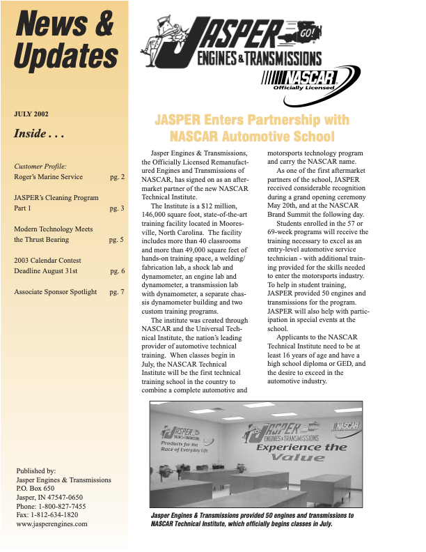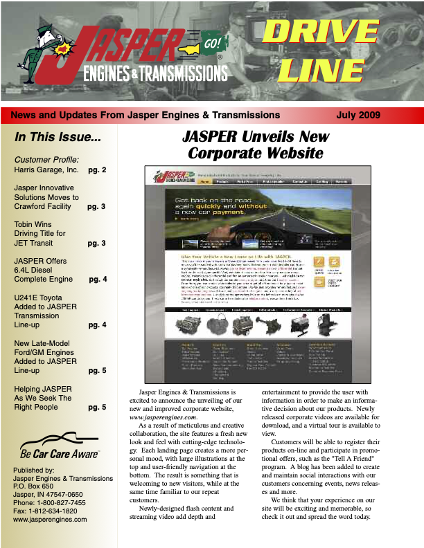 Features: Customer Profile: Harris Garage, Inc., Jasper Innovative Solutions Moves to Crawford Facility, Tobin Wins Driving Title for JET Transit, JASPER® Offers 6.4L Diesel Complete Engine, U241E Toyota Added to JASPER® Transmission Line-up, New Late-Model Ford/GM Engines Added to JASPER® Line-up, Helping JASPER® As We Seek The Right People.