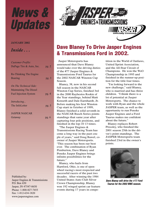 Features: Customer Profile: DuPage Tire & Auto, Inc., Re-Thinking The Engine Bearing, On The Technical Side: Maintaining The Diesel Fuel Injection System, Introducing… The InfoLetter, JASPER® NASCAR Getaway.