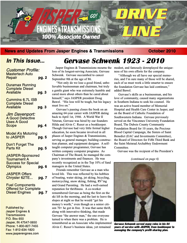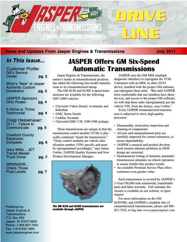 Features: Customer Profile: Gill’s Service Center, What’s “New” at Jasper Authentic Custom Drivetrains, JASPER® Sponsors Ohio Rodeo, A Strive to Thrive Testimonial, Craig Hessenauer: 2011… Failure to Communicate, Crawford County Expansion Complete, Gary Witte… JET Transit Master Truck Driver, 5R55N/S/W… Check Those Fluid Levels