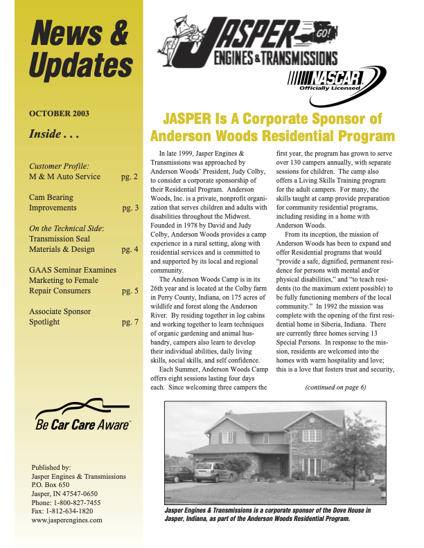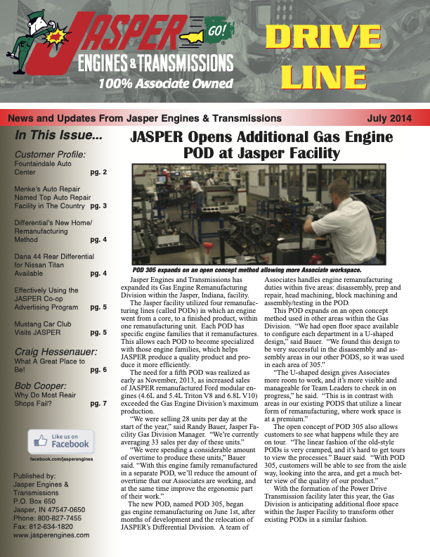 Features: Customer Profile: Fountaindale Auto Center, Menke’s Auto Repair Named Top Auto Repair Facility in The Country, Differential’s New Home/Remanufacturing Method, Dana 44 Rear Differential for Nissan Titan Available, Effectively Using the JASPER® Co-op Advertising Program, Mustang Car Club Visits JASPER®, Craig Hessenauer: What A Great Place to Be!, Bob Cooper: Why Do Most Shops Fail?