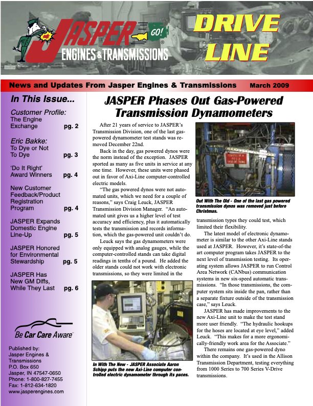 Features: Customer Profile: The Engine Exchange, Eric Bakke: To Dye or Not To Dye, ‘Do It Right’ Award Winners, New Customer Feedback/Product Registration Program, JASPER® Expands Domestic Engine Line-Up, JASPER® Honored for Environmental Stewardship, JASPER® Has New GM Diffs, While They Last