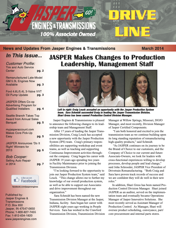 Features: Customer Profile: Tire and Auto Service Center, Remanufactured Late-Model GM 5.3L Engines Now Available, Ford 4.6L/5.4L 3-Valve VVT Oil Pump Update, JASPER® Offers Co-op Advertising Program for Qualified Installers, Seattle Branch Takes Top Award from Annual Sales Banquet, myjasperaccount.com Makes Core Pick-Up Easy, JASPER® Announces ‘Do It Right’ Winners for 2013, Bob Cooper: Selling Auto Repair in 2014