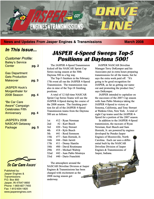 Features: Customer Profile: Bailey’s Service Center, Gas Department Gets Production Makeover, JASPER® Hook’s Morgenthaler for 2008 Season, “Be Car Care Aware” Campaign Celebrates Fifth Anniversary, JASPER’s 2008 NASCAR Getaway Package.