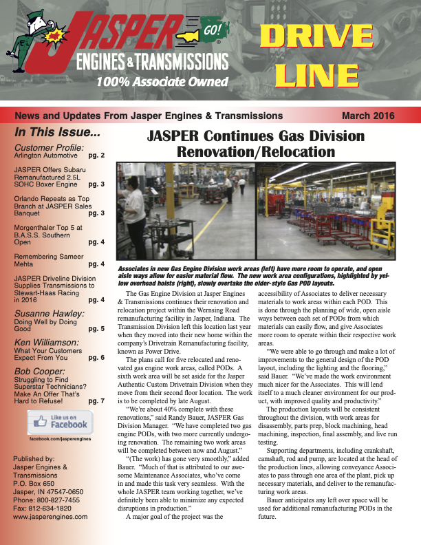 Features: Customer Profile: Arlington Automotive, JASPER® Continues Gas Division Renovation/Relocation, Jasper, Indiana, JASPER® Offers Subaru Remanufactured 2.5L SOHC Boxer Engine, Orlando Repeats as Top Branch at JASPER® Sales Banquet, Morgenthaler Top 5 at B.A.S.S. Southern Open, Remembering Sameer Mehta, JASPER® Driveline Division Supplies Transmissions to Stewart-Haas Racing in 2016, Ken Williamson: What Your Customers Expect From You