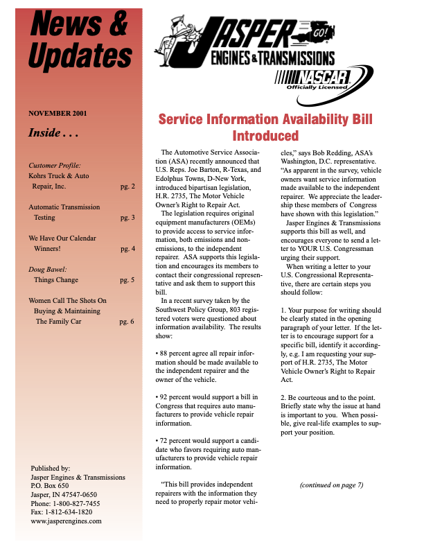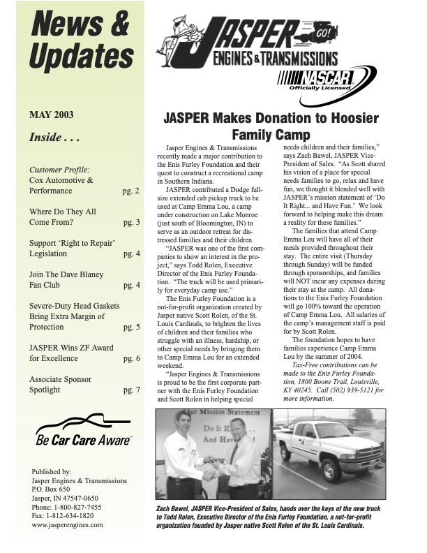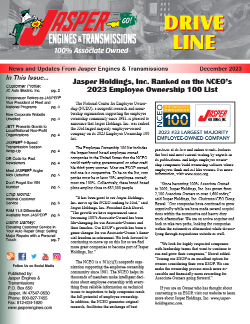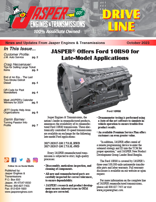 Features: Customer Profile: JC Auto Electric, Inc. pg. 2, Hessenauer Retires as JASPER® Vice President of Fleet and National Programs pg. 3, New Corporate Website Unveiled pg. 3, JETT Presents Grants to Local/National Non-Profit Organizations pg. 4, JASPER® 4-Speed Transmission Season Wrap-Up pg. 4, QR Code for Past Newsletters pg. 4, Meet JASPER® Angler Nick Uebelhor pg. 5, Don’t Forget the VIN Number pg. 5, Chip Morris: Internal Customer Service pg. 6, RAM 11.8 Differential Available from JASPER® pg. 6, Darrin Barney: Elevating Customer Service in Your Auto Repair Shop: Selling Major Repairs with a Personal Touch pg. 7