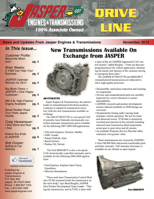 Features: Customer Profile: Marysville Motor Cars, Brian Weeks: A VSM Can Help Your Business, JASPER® Calendar Winners for 2014, Big Block Chevy + JASPER = One Happy Customer!,GM 3.6L High-Feature Engine Available, Street Rodder Road Tour Visits Jasper Facility, Craig Hessenauer: I Was Blind and Now I See, Kolene Era Ends at JASPER®, Bob Cooper: Selling at Car Delivery