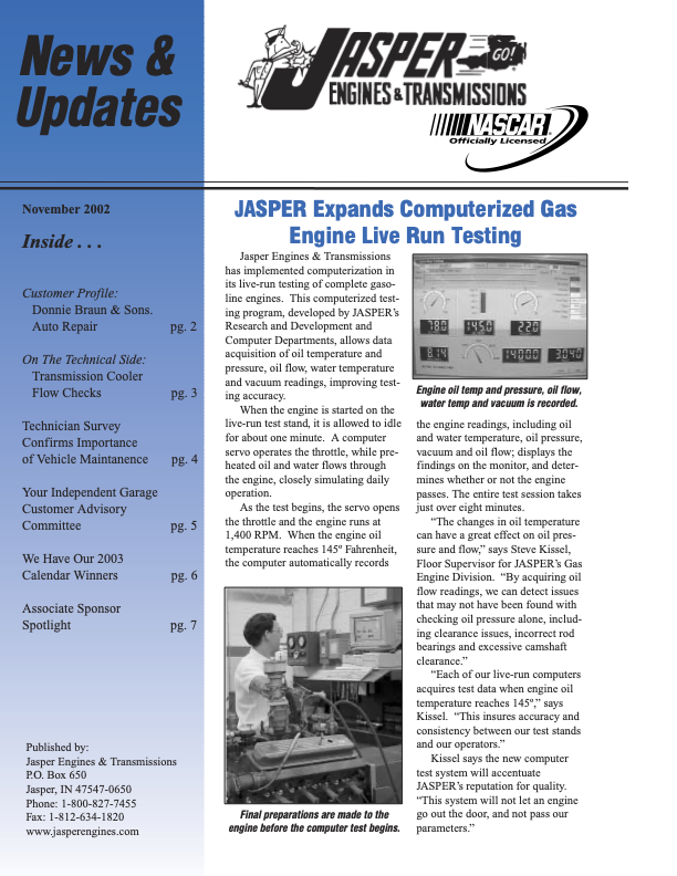 Features: Customer Profile: Dan’s Auto & Tire Service, JASPER® Solves GM V6 Cam Bore Alignment Issues, The 21st Century Tune-Up, Two Top-10 Outings for Chad Morgenthaler, A Letter of Thanks From A Satisfied JASPER® Installer.
