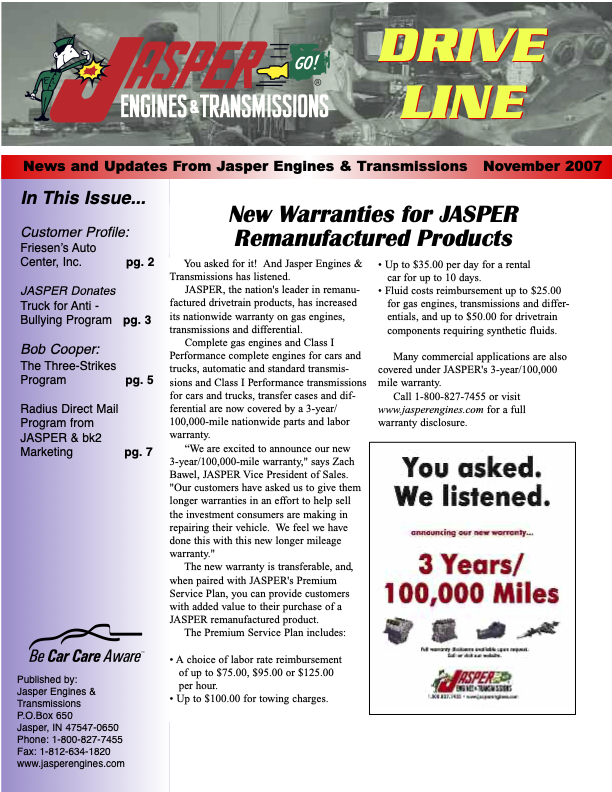 Features: Customer Profile: Friesen’s Auto Center, Inc., JASPER® Donates Truck for Anti-Bullying Program, Bob Cooper: The Three-Strikes Program, Radius Direct Mail Program from JASPER® & bk2 Marketing.