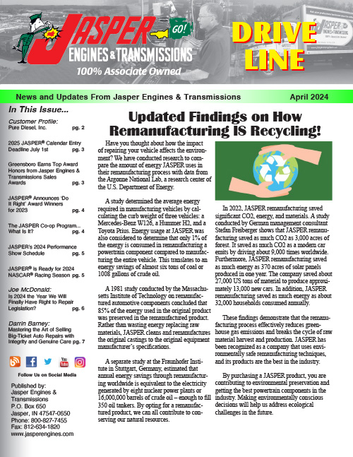 Features: Customer Profile: Pure Diesel, Inc. pg. 2, 2025 JASPER® Calendar Entry Deadline July 1st pg. 3, Greensboro Earns Top Award Honors from Jasper Engines & Transmissions Sales Awards pg. 3, JASPER® Announces ‘Do It Right’ Award Winners for 2023 pg. 4, The JASPER Co-op Program… What Is It? pg. 4, JASPER’s 2024 Performance Show Schedule pg. 5, JASPER® is Ready for 2024 NASCAR® Racing Season pg. 5, Joe McDonald: Is 2024 the Year We Will Finally Have Right to Repair Legislation? pg. 6, Darrin Barney: Mastering the Art of Selling Big-Ticket Auto Repairs with Integrity and Genuine Care pg. 7