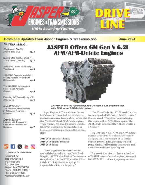 Features: Customer Profile: Jim the Boat Guy pg. 2, Sugino CNC Washer Used in Transmission Cleaning pg. 3, Axiline VBT 8000 Valve Body Test Stand pg. 3, JASPER® Expands Availability of Late-Model Ford and GM Differentials pg. 4, The JASPER® Independent Fleet Repair Advisory Council pg. 4, Dropping EV Values Fortify ICE Aftermarket pg. 5, Joe McDonald: The Power of Measurement in Achieving Business Success pg. 6, Darrin Barney: Leading with Purpose: 8 Must-Know Practices for Success pg. 7
