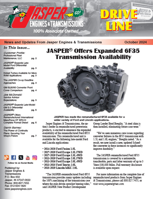 Features: Customer Profile: Professional Fleet Maintenance, LLC pg. 2, JASPER® Expands Late-Model Ford Differential Availability pg. 3, Holset Turbos Available for More RAM Applications pg. 3, The JASPER® Co-op Deadline Approaches pg. 4, GM 6L80/90 Converter Front Cover Comparison pg. 4, Joe McDonald: Service Advisor Expectations pg. 5, JASPER® Expands Late-Model GM 9.5 Differential Availability pg. 6, JASPER® Offers Remanufactured International MaxxForce DT EPA10 Complete Format Diesel pg. 6, Darrin Barney: The Power of Continuity Plans: Securing Your Shop’s Future pg. 7