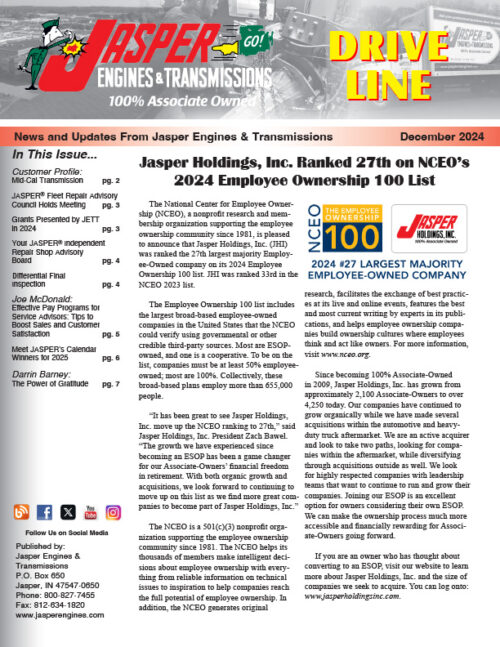 Features: Customer Profile: Mid-Cal Transmission pg. 2, JASPER® Fleet Repair Advisory Council Holds Meeting pg. 3, Grants Presented by JETT in 2024 pg. 3, Your JASPER® Independent Repair Shop Advisory Board pg. 4, Differential Final Inspection pg. 4, Joe McDonald: Effective Pay Programs for Service Advisors: Tips to Boost Sales and Customer Satisfaction pg. 5, Meet JASPER’s Calendar Winners for 2025 pg. 6, Darrin Barney: The Power of Gratitude pg. 7