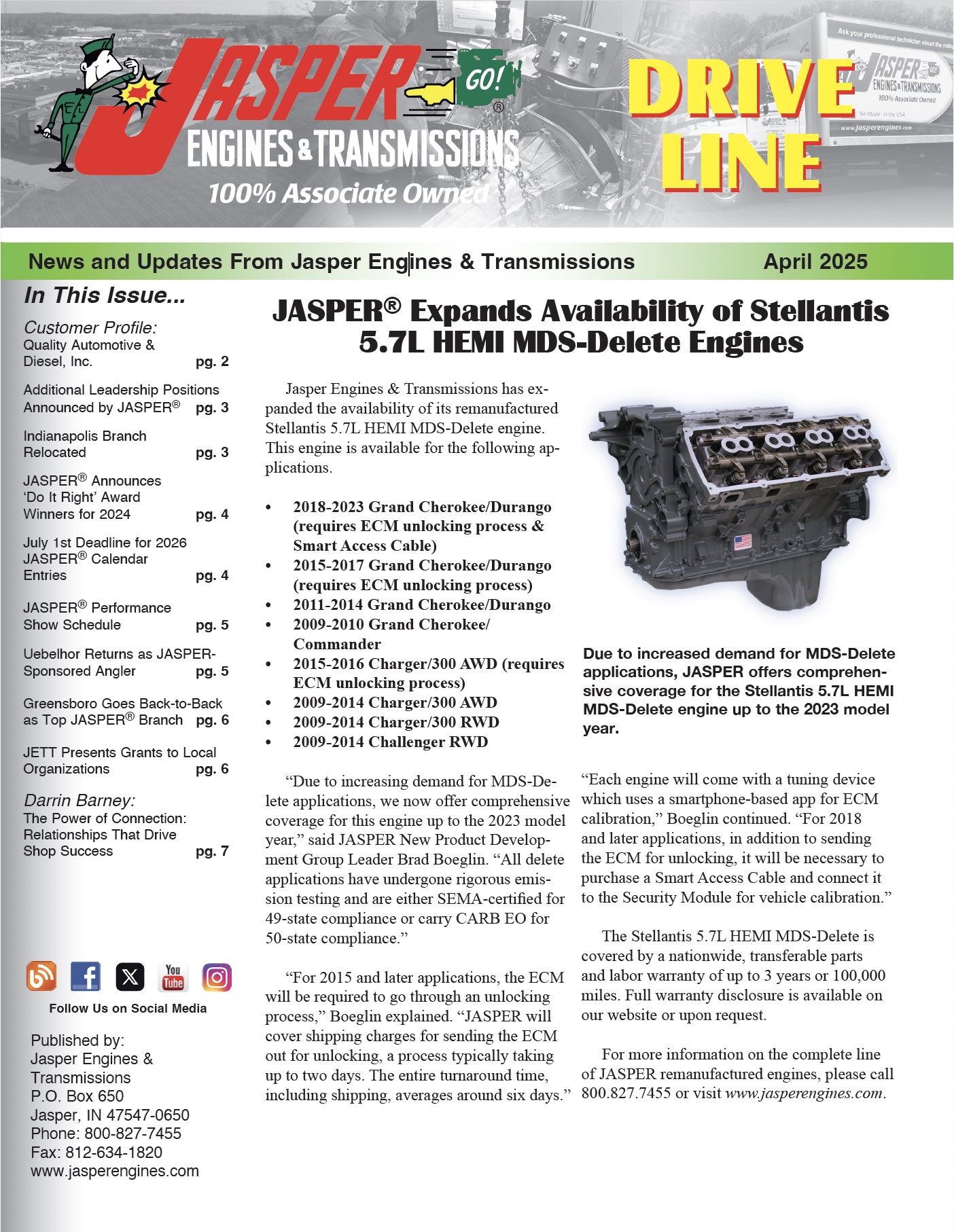 Features: Customer Profile: Quality Automotive & Diesel, Inc. pg. 2, Additional Leadership Positions Announced by JASPER® pg. 3, Indianapolis Branch Relocated pg. 3, JASPER® Announces ‘Do It Right’ Award Winners for 2024 pg. 4, July 1st Deadline for 2026 JASPER® Calendar Entries pg. 4, JASPER® Performance Show Schedule pg. 5, Uebelhor Returns as JASPER-Sponsored Angler pg. 5, Greensboro Goes Back-to-Back as Top JASPER® Branch pg. 6, JETT Presents Grants to Local Organizations pg. 6, Darrin Barney: The Power of Connection: Relationships That Drive Shop Success pg. 7
