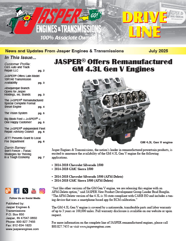 Features: Customer Profile: C&S Auto and Truck Repair LLC pg. 2, JASPER® Offers Late-Model 10R140 Transmission Availability pg. 3, Albuquerque Branch Opens for Jasper Holdings, Inc. Brands pg. 3, The JASPER® Remanufactured Special Complete Format Diesel Engine pg. 4, The Vision System pg. 5, Big Block Ford + JASPER® = One Happy Customer! pg. 5, The JASPER® Independent Fleet Repair Advisory Council pg. 6, JETT Presents Grant to Local Fire Department pg. 6, Darrin Barney: Don’t Freeze – Focus: Strategies for Thriving In a Tough Economy pg. 7